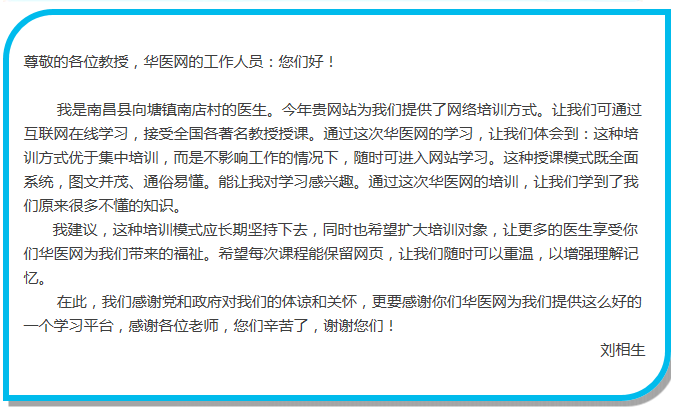 我们怀着崇敬的心情打开了这位基层的卫生战士的来信。读完信后,我们马上跟刘医生取得联系。刘医生告诉我们,从2010的公共卫生服务培训到今年的急诊急救培训,从最开始的大家集中在一起用机顶盒培训到如今自己安排时间在计算机前学习,连续5年的培训让他受益匪浅。十几分钟的电话中刘医生又为我们提出了好多宝贵的的建议。