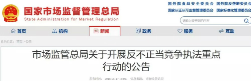 5月17日,国家市场监督管理总局发布《关于开展反不正当竞争执法重点行动的公告〔2018年第4号〕》。