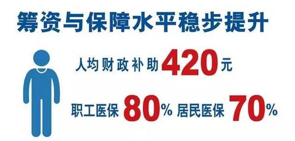 2016年城镇基本医保基金收入12751.1亿元,城乡居民参保政府补助标准提高到人均420元,占人均筹资的70%以上;保障水平稳步提高,职工医保政策范围内住院医疗费用基金支付比例超过80%,居民医保达到70%。