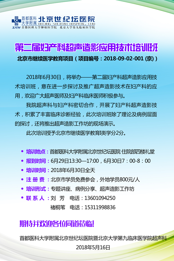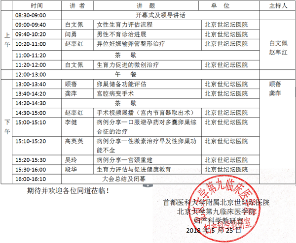 由首都医科大学附属北京世纪坛医院举办的“第四届生育力评估与促进培训班”,将于2018年7月1日在北京世纪坛医院四楼礼堂举办。热忱欢迎妇科、超声科、男科、麻醉科、日间病房等相关科室医生、护士和医院管理人员积极参加,不限名额。