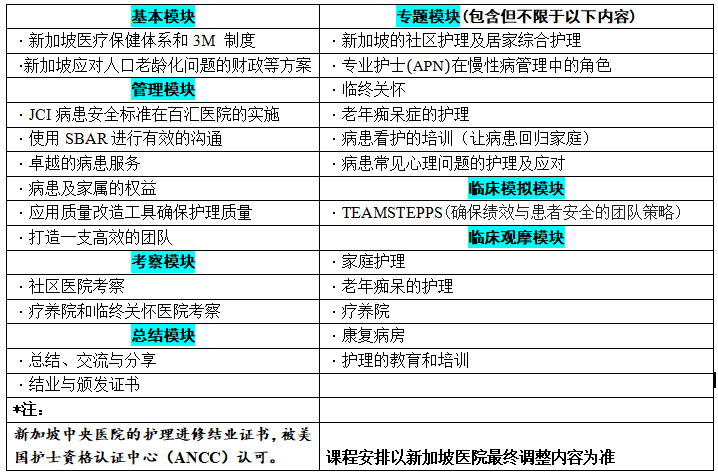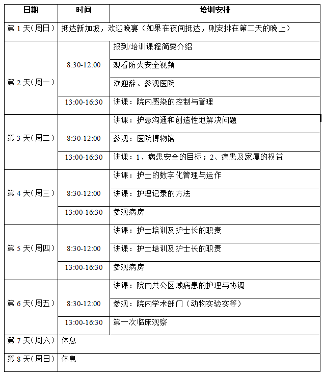 行程安排:14天(含往返),主要内容包括医院护理专科深入参访、护理领域专题讲座与授课,与顶级护理专家交流、深入临床体验并模拟实操等。