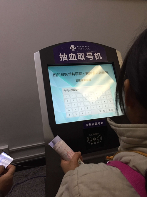 四川省人民医院检验科副主任蒋黎告诉记者,过去采血者的采血过程都是依靠人工完成,先由护士核对患者信息,然后人工贴标签,再将贴有标签的试管送到采血区,由窗口护士叫号采血。由于整个过程都是人工完成,不仅效率低,也容易出错。目前,四川省医院的日门诊量在超过万人次,每天需要采血的患者在1500-2000左右。“以前,每个采血者都需要等待2个小时左右时间”,蒋黎说,新的采血系统启用后,不仅提高了效率,降低了差错率,16个分检机也使过去的采血窗口由8个增加到16个,在既提高效率又增加窗口的情况下,现在采血者最多只需等待30分钟就能完成采血整个过程。蒋黎说,目前这套国产化的全自动智能化采血系统也是国内最大的。