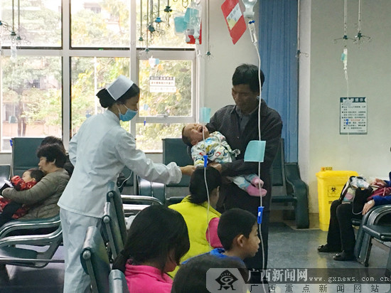 图为区医院急诊输液室内,护士正在照顾病患。广西新闻网记者 黄勇椋 摄