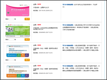 3、注册完成的学员输入用户名和密码登录,点击“在线购卡”,选择“乡村全科执业助理医师资格考试辅导学习卡”,完成在线支付,获得卡号和密码。