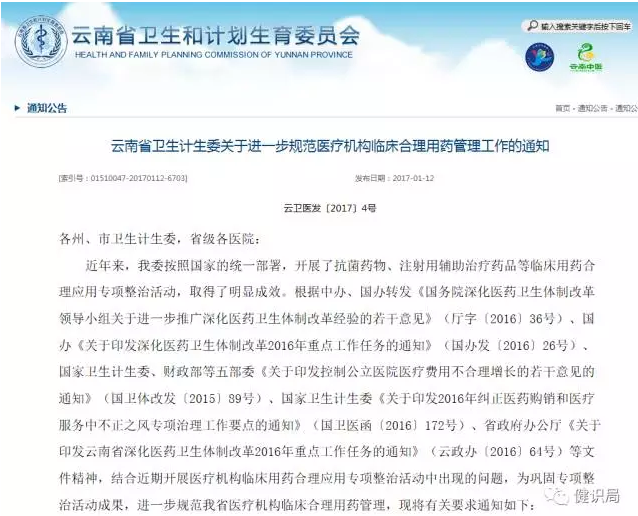 2017年1月12日,云南省卫生计生委下发《关于进一步规范医疗机构临床合理用药管理工作的通知》(云卫医发[2017]4号),要求全省各级各类医疗机构,重点是二级以上公立医疗机构,依据药价、药品采购金额、临床用药情况等制定本医院的重点监控目录,并且实行超常使用预警制度。