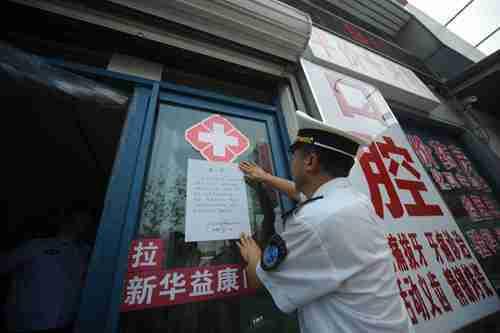 结合前期对非法行医摸底暗访的情况,今天上午,北京市卫计委在昌平、朝阳、大兴以及通州开展突击查处行动,集中处置了昌平区燕丹村“新华益康诊所”、朝阳区奶西村“惠尔康医院奶西分院”和“姜氏口腔”等45家藏匿在城乡交界结合部和乡村、街道较为隐秘地点的“黑诊所”,查获非法医疗器械若干以及药品445公斤。根据前期暗访的线索,上午十点,由市卫计委、市食药监局、市工商局、公安部门等组成的联合行动组来到昌平区燕丹村“新华益康诊所”。北京青年报记者在现场看到,诊所内一楼有四五位患者正在输液,另有一位自称是诊所医生,以及一名诊所护士。执法人员要求诊所出示医疗机构执业许可证以及执业医师资格证,诊所迟迟无法提供相关资质证明,两名“医护人员”表示诊所负责人不在。