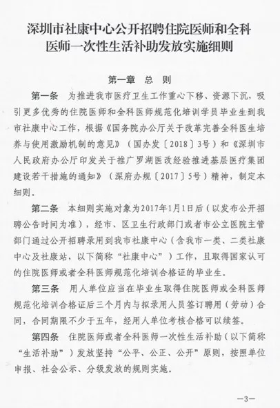 值得注意的是,细则实施对象为2017年1月1日后(以发布公开招聘公告时间为准),经市、区卫生行政部门或者市公立医院主管部门通过公开招聘录用到社康中心(含深圳市一类,二类社康中心及社康站,以下简称“社康中心”)工作,且取得国家认可的住院医师或者全科医师规范化培训合格证的毕业生。