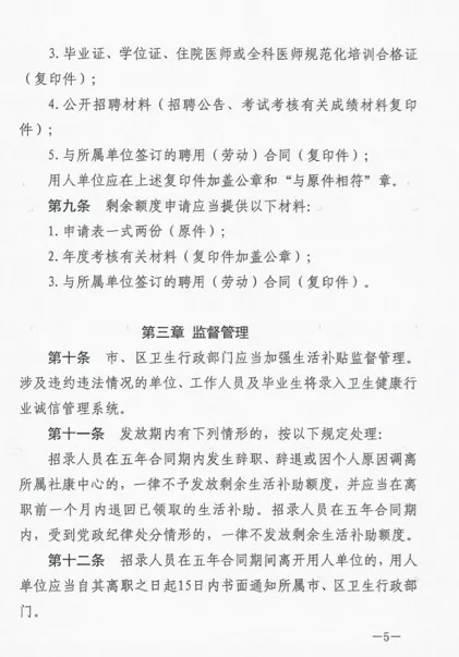 细则中提出,招录人员在五年合同期内发生辞职、辞退或因个人原因调离所属社康中心的,一律不予发放剩余生活补助额度,并应当在离职前一个月内退回已领取的生活补助。招录人员在五年合同期内,受到党政纪律处分情形,一律不发放剩余生活补助额度。
