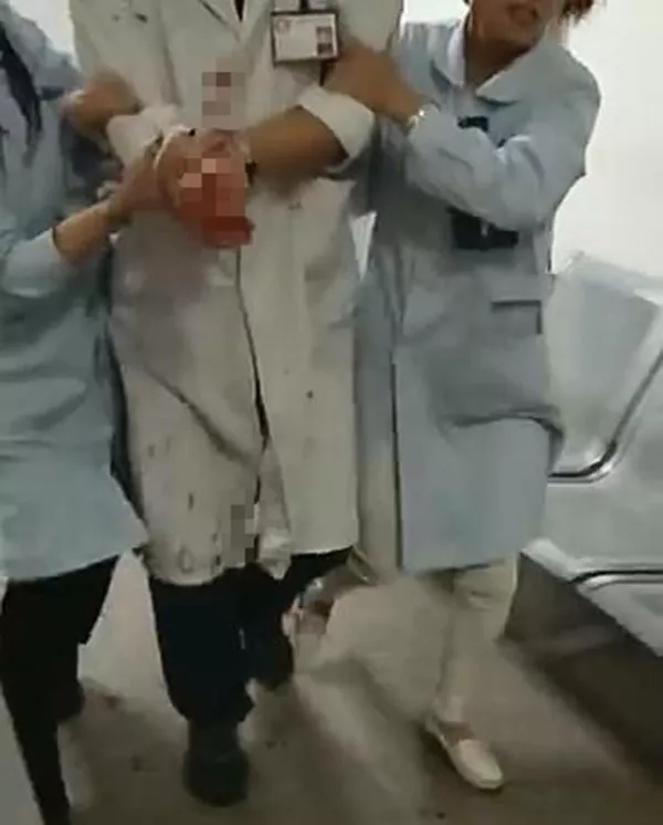 根据网传视频,事发后,一名身着白大褂的医生用左手捂住右手臂,白大褂上已沾有血迹,两名医务人员扶着他经过门诊楼内的过道。此前,其中一人拿着一把疑似凶器的刀,看上去长三四十厘米。25日11时40分许,记者在医院门诊楼3楼发现,医院的诊疗秩序已恢复正常,一名清洁工仍在清理过道地面,医务人员提醒她用“84消毒液”,以消除地面上的味道。