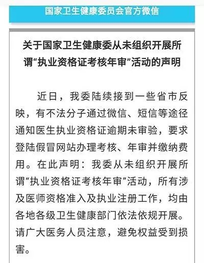 这份声明称,近日,我委陆续接到一些省市反映,有不法分子通过微信、短信等途径通知医生执业资格证逾期未审验,要求登陆假冒网站办理考核、年审并缴纳费用。在此声明,我委从未组织开展所谓“执业资格证考核年审”活动,所有涉及医师资格准入及执业注册工作,均由各地各级卫生健康部门依法依规开展。