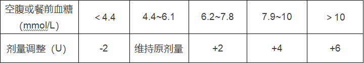 优化治疗开始后,每3~5天滴定1次预混胰岛素类似物的剂量,晚餐前胰岛素的剂量可根据空腹血糖测量值来调整,再根据晚餐前血糖测量值调整第二天早餐前的胰岛素剂量。具体的滴定方案参见下表31-35: