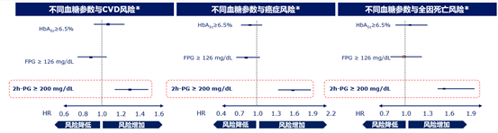 针对中国40岁左右成年人的多中心、前瞻性的4C研究21,纳入193846名成人受试者,将2h-PG、FPG和HbA1c纳入同一个多因素校正模型进行分析,提示基线时合并2h-PG≥11.1mmol/L的未经治疗的糖尿病是心血管事件风险、肿瘤风险,及全因死亡的独立危险因素。